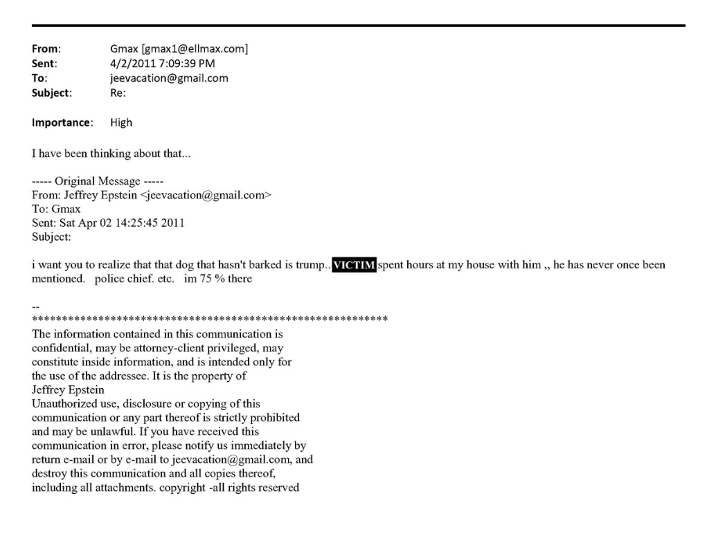 I’m not saying Trump is a pedophile or whoremonger. Instead, I’m noting this recently released email between Jeffrey Epstein and Ghislaine Maxwell in 2015 where Epstein writes “…[victim] spent hours at my house with [Trump]”. The email clearly appears to be part of a discussion where Ghislaine and Epstein are contemplating blackmailing Trump about his interaction with said unnamed victim.