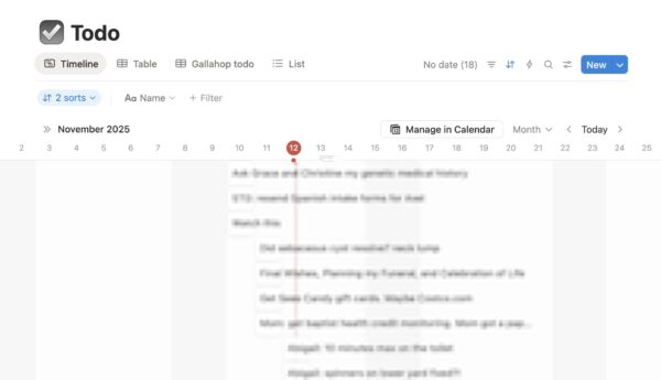 • Todo items – with due dates/deadlines – kept in a Notion Timeline – this is for todo items I need to start working on particular date